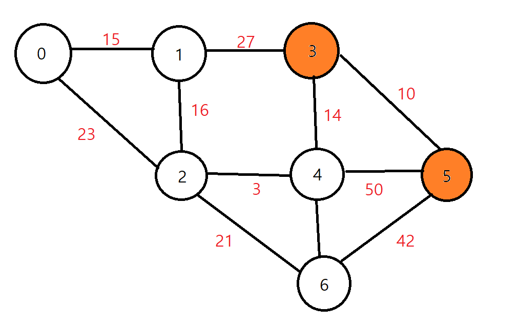 가중치가 큰 순서대로 연결을 해줄 때, 우리가 생각해야 하는 부분은 최초로 3-5가 연결되는 지점이다.