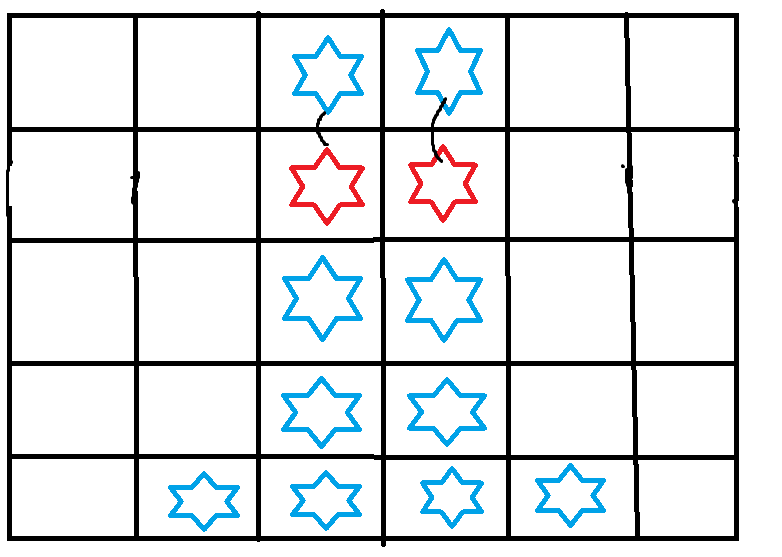 아래와 같은 경우다. 2개의 미네랄 클러스터가 생기게 된다. 현실 세계에서는 중력이 존재하기 때문에, 이 미네랄 클러스터는 공중에 뜰수가 없어서, 당연히 밑의 바닥이나, 다른 미네랄클러스터 위에 얹어지게 된다. (빨간색 별으로 위치가 바뀐다)