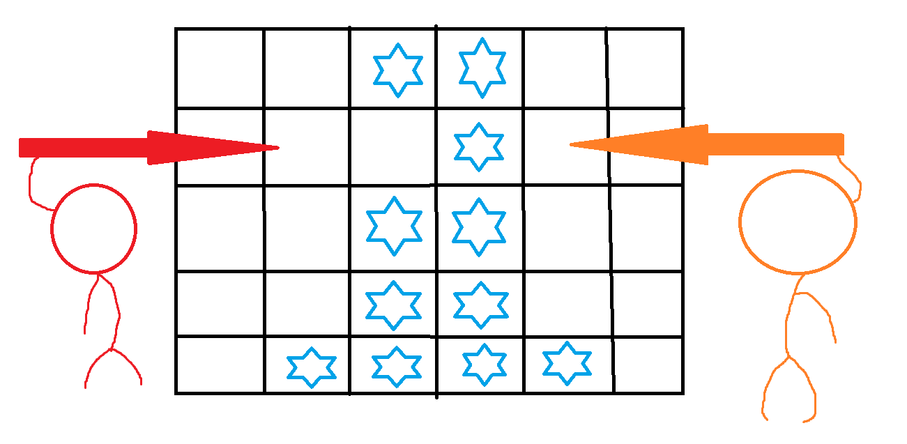 - 창영은 동굴의 왼쪽에 서있고, 상근은 오른쪽에 서있다. 두 사람은 턴을 번갈아가며 막대기를 던진다. 막대를 던지기 전에 던질 높이를 정해야 한다. 막대는 땅과 수평을 이루며 날아간다.