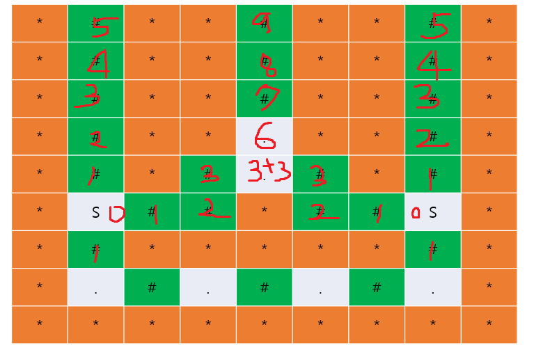 이때, 처음 만나는 시점을 알기위해서, 3가지 방문 배열의 정보가 필요하게 된다. 각각 2차원 배열의 i,j에 대응하는 값들의 합을 구해주고, "#"인 경우 합에서 2를 빼준다음(중복되므로), 그 값이 최소가 되는 순간이 처음 마주치는 경우이다. (문의 갯수의 정보만 알면 되므로, 사실 언제 딱 처음만났는지는 정확하게 반영되어있지 않지만, 어쨌든 확실한건, 문을 최소한으로 열고 우리는 만났다는 점이다)