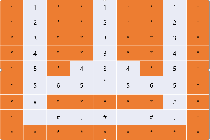 - 첫째 줄에는 평면도의 높이 h와 너비 w가 주어진다. (2 ≤ h, w ≤ 100) 다음 h개 줄에는 감옥의 평면도 정보가 주어지며, 빈 공간은 '.', 지나갈 수 없는 벽은 '*', 문은 '#', 죄수의 위치는 '$'이다.