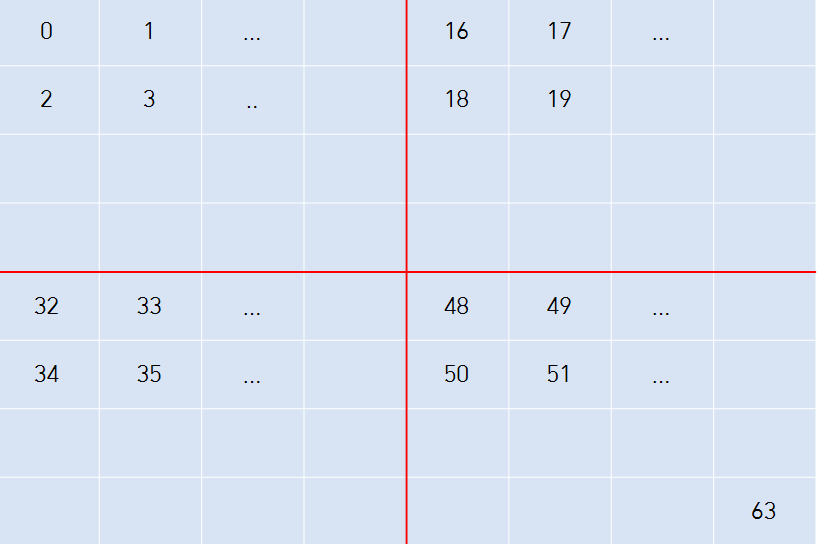 - N > 1인 경우, 배열을 크기가 2N-1 × 2N-1로 4등분 한 후에 재귀적으로 순서대로 방문한다.