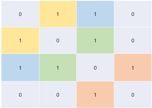 위의 그래프를 인접행렬로 생각한다면, 옆의 그림과 같이 될것임. 그럼 이걸 코드로 어떻게 구현할까.
