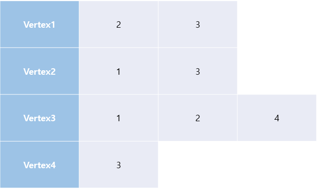그럼, adj에는 adj= [ [2,3] , [1,3] ,[1,2,4],[3] ]