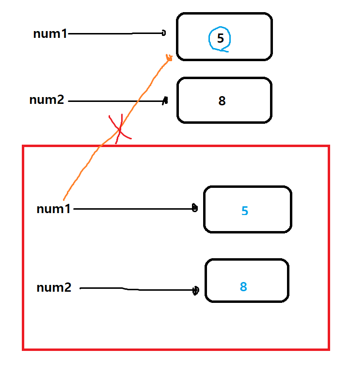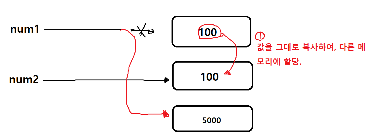 혹시, 위의 과정이 이렇게 흘러간다고 생각하시지 않았나요? num1에 저장되어있는 100을 500으로 바꾼다.