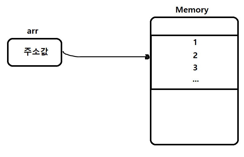 이제, 아래의 그림에 대해서는 설명을 안해도 되겠죠? 메모리 공간에 다음과 같이 할당이 됩니다. (정확히는 arr도 메모리 안에 있지만, 가독성을 위해서 밖으로 뺏습니다)