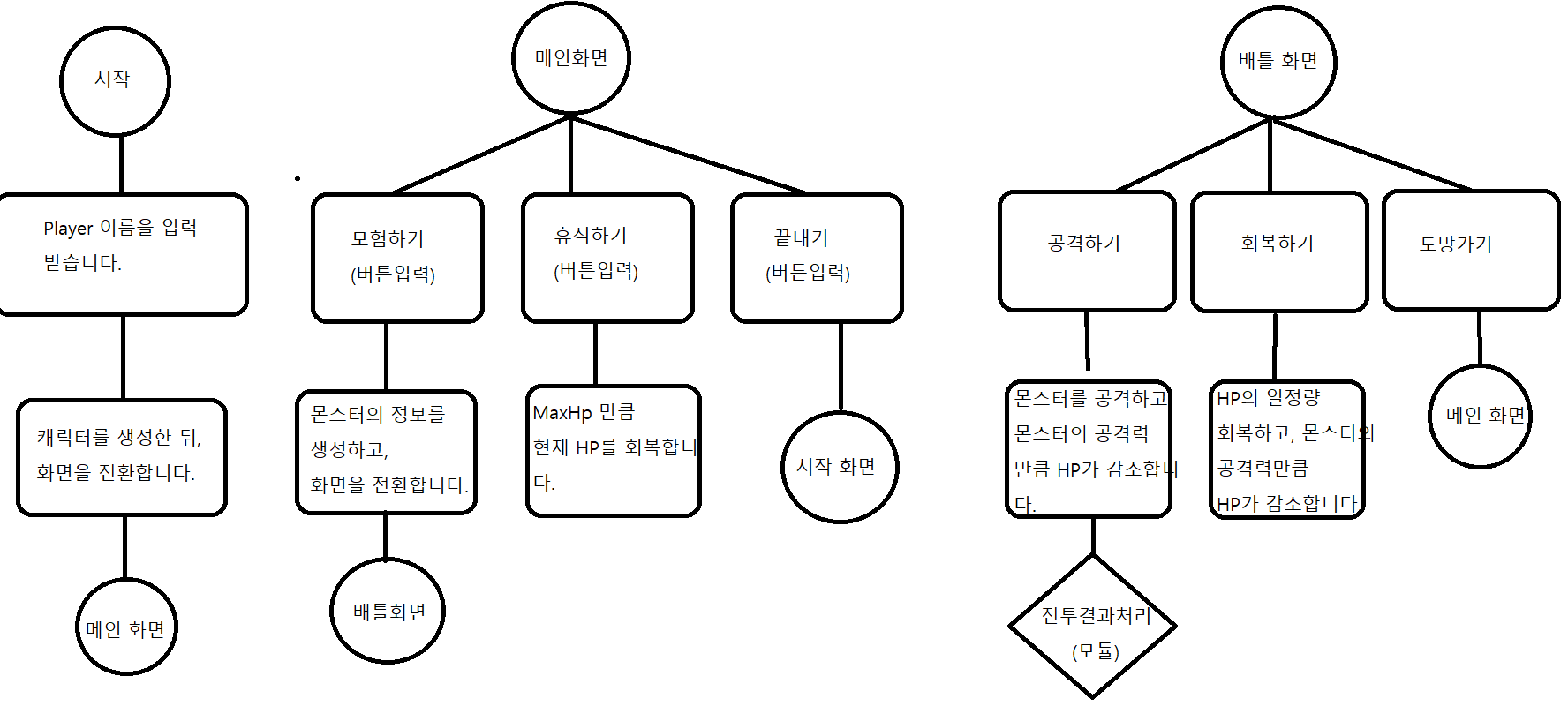 화면 별로 순서도를 그려보았습니다. 시작화면 , 메인화면 , 배틀화면 3가지 화면으로 구성이 되고, 내부 로직은 순서도에 나타난 것과 같습니다.