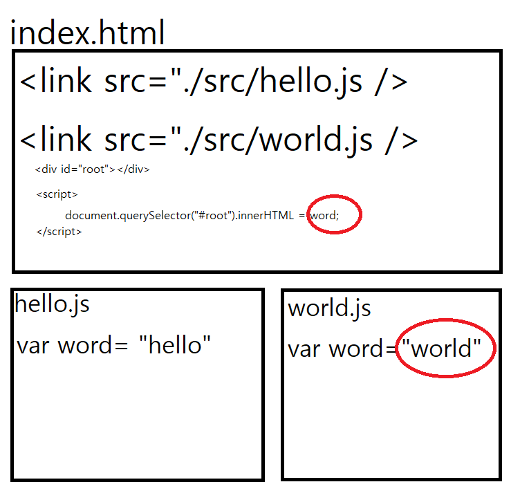 - 하지만, 더 심각한 문제가 있었다. JS파일이 많아지면서 변수가 overlapping(덮여쓰기)되는 현상이 발생했다고 한다.