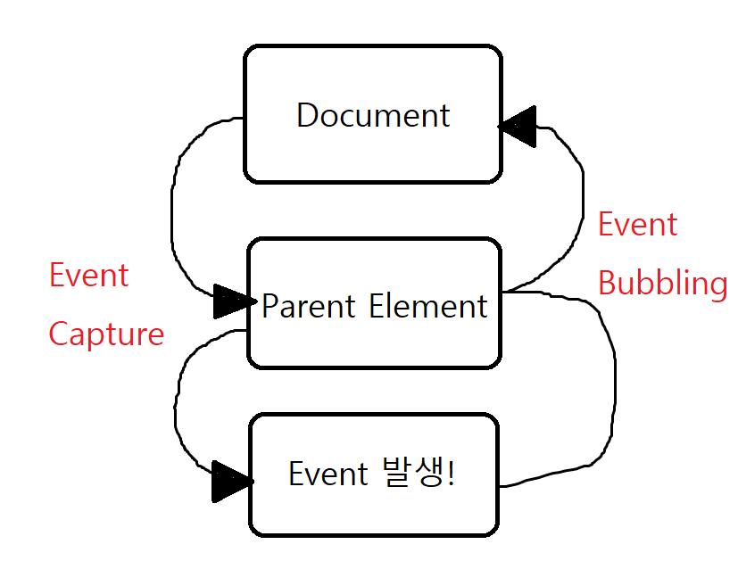 기본적으로 이벤트가 발생한 Element에서 상위의 Element로 이벤트가 전파됩니다. 반대흐름인 Event Capture옵션도 있습니다만, Default는 Event Bubbling입니다. 즉, 이벤트가 발생한 태그가 최상위 태그로 "나 이벤트 발생했음!"을 알리는거죠. 코드로 보면 아래와 같습니다.