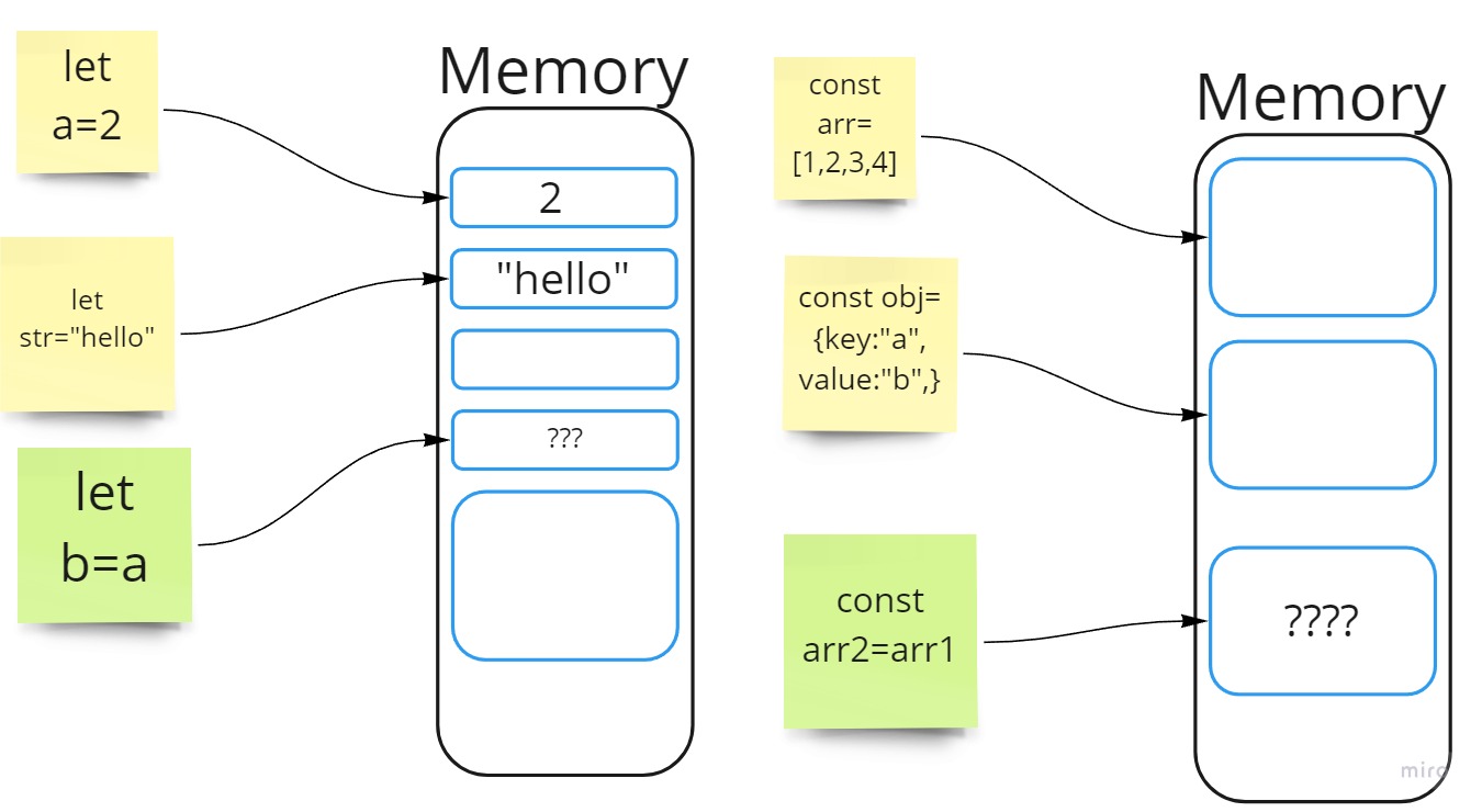 JS에서는 자료형이 메모리에 저장되는 방식의 차이로, primitive한 값과 reference한 값 2가지의 형태로 나뉜다.