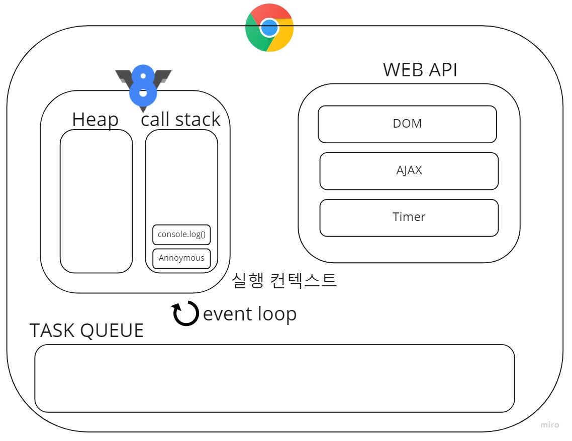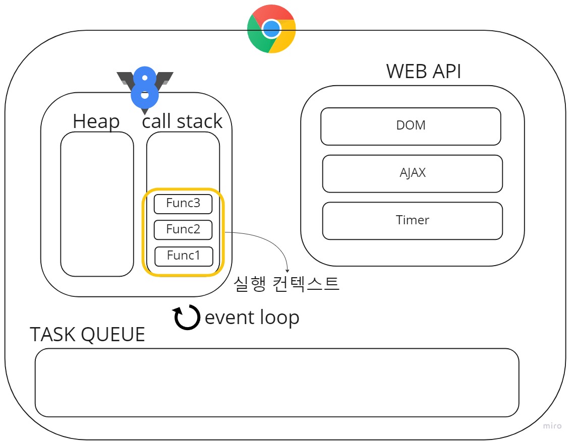 Chrome을 간소화 시키면 아래와 같은 구조를 띄게 됩니다. 실행 컨텍스트는 간단하게 이야기하면, "call stack에 쌓이는 로직들에 대한 모든 내용" 입니다. 우리가 실행하는 함수나 로직들은 call stack에 순차적으로 하나씩 쌓이게 됩니다. (즉, 들어온대로 처리가 된다는거죠!)