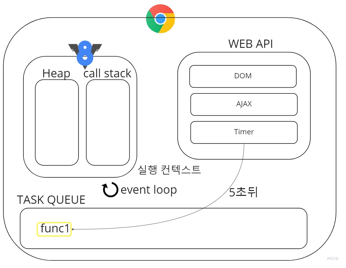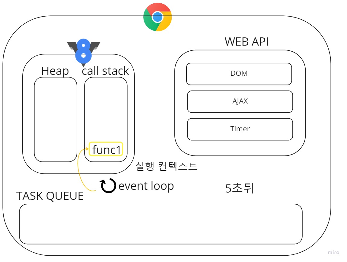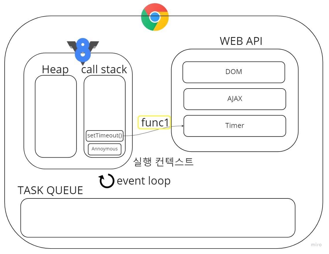 2. console.log() 실행이 끝나고, setTimeout이 실행됩니다. setTimeout은 실행됬다가, 비동기함수이므로 WebAPI에게 callback을 던집니다. 여기서는 func1을 던지겠네요!