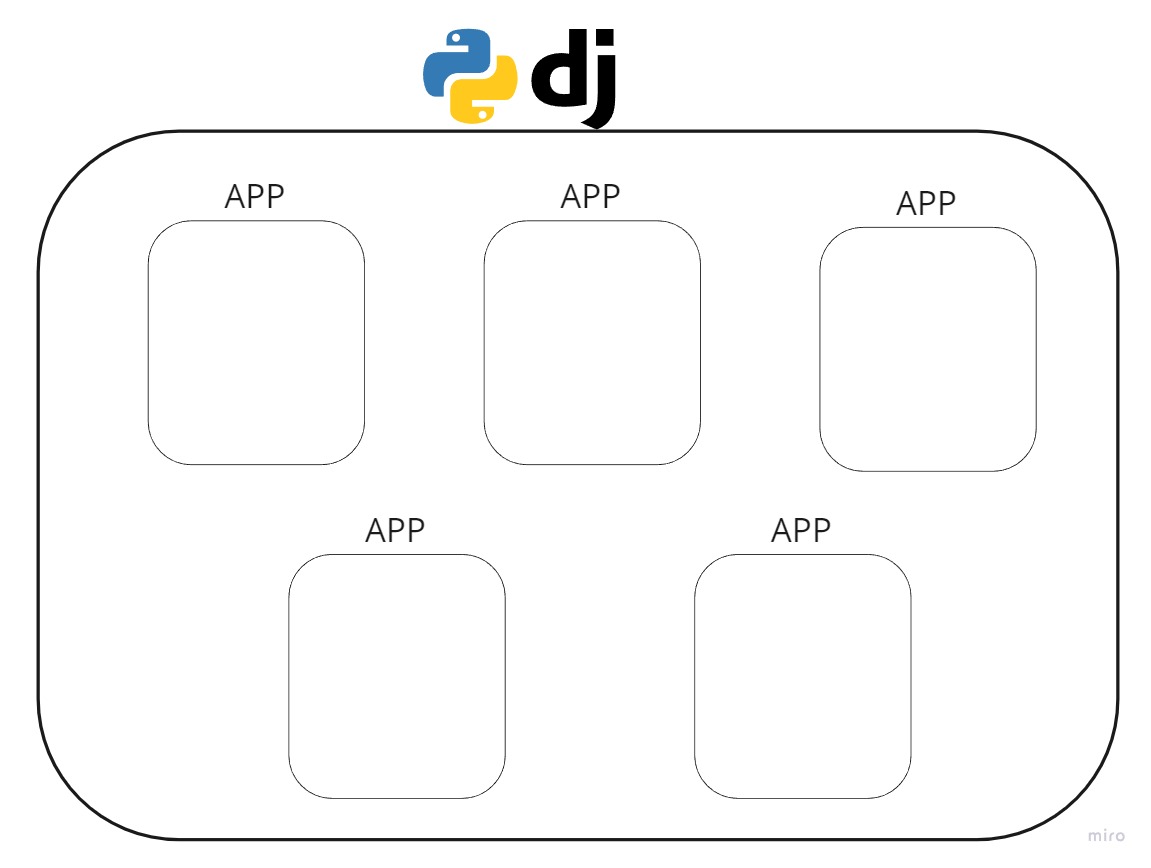 Django는 Project 1개에 여러가지 App들이 결합되는 형태로 구성이 됩니다. App은 Data와 Logic이 묶인 하나의 모듈이라고 생각하면 됩니다. 그리고, Django는 Setting.py를 통해서 , App들을 서로 연결하고 하나의 서비스로 만들어줍니다.