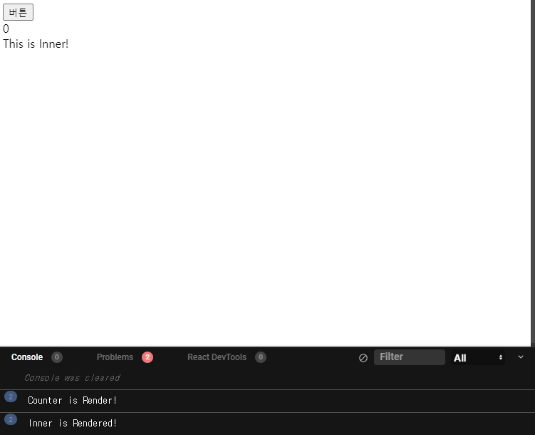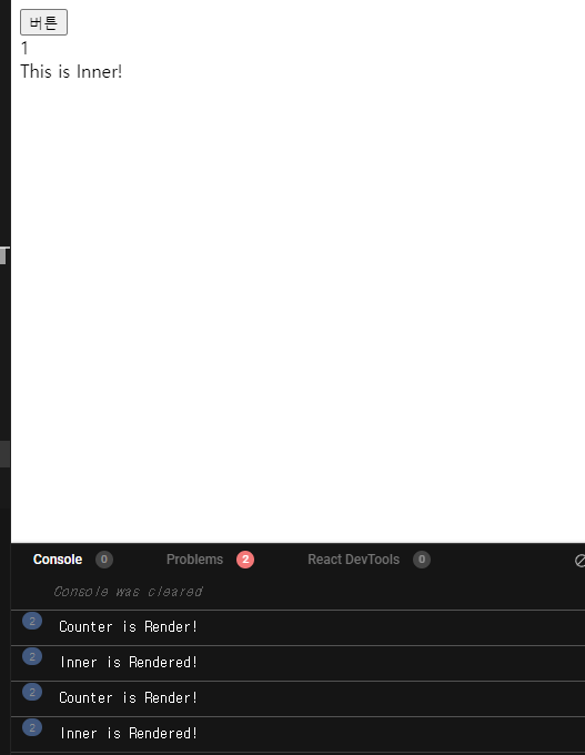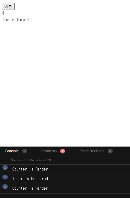 버튼을 클릭하면 , 어떻게 될까요 ? 네 , 당연히 Counter가 리렌더링 되면서 , Inner가 리렌더링 됩니다.