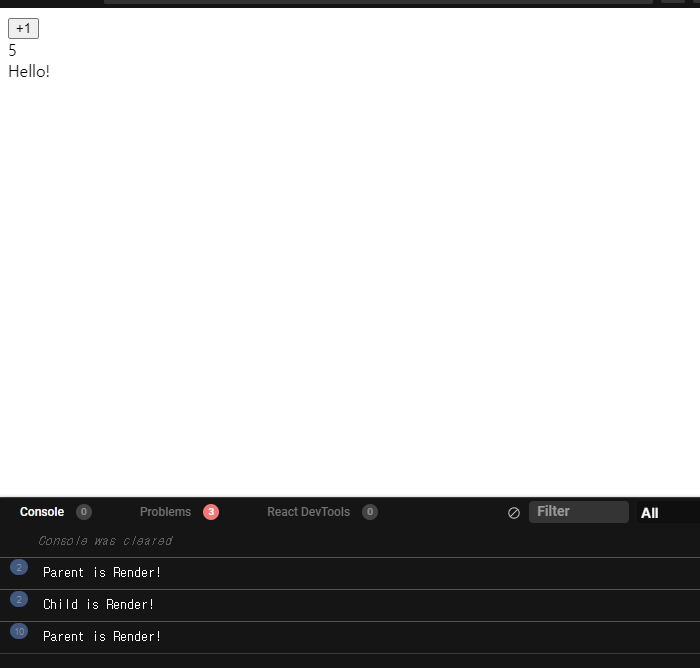 의도했던대로, 하위 컴포넌트가 리렌더링 되지않습니다. 이건, 새로운 Props가 전달되지 않죠! 알아둡시다. 컴포넌트는 매번 새롭게 할당되지 않습니다.
